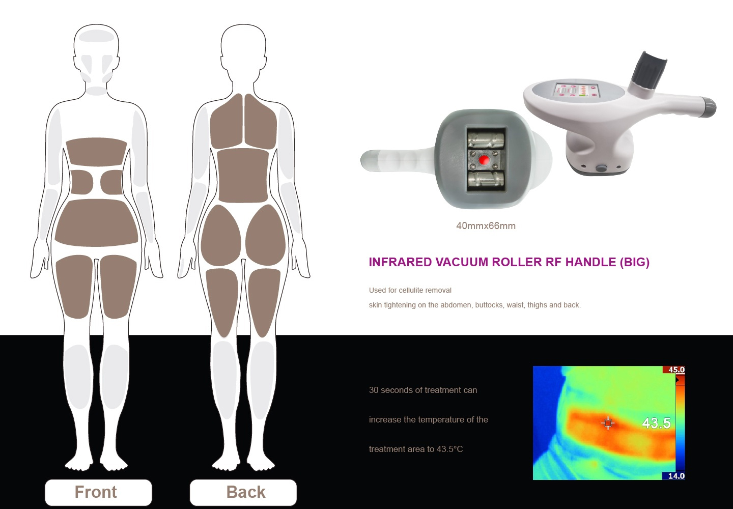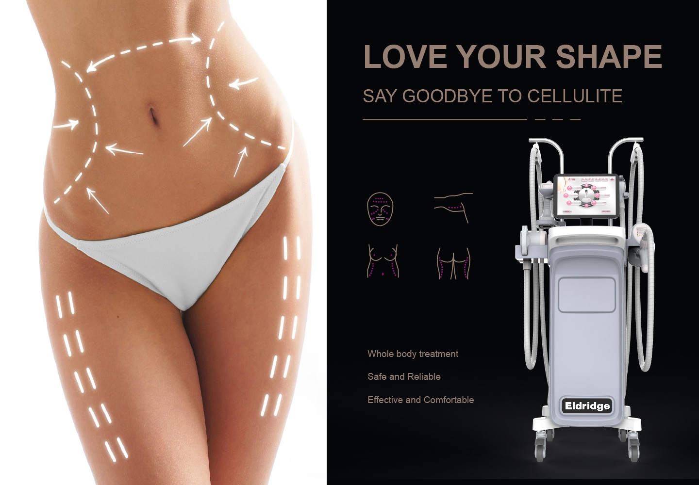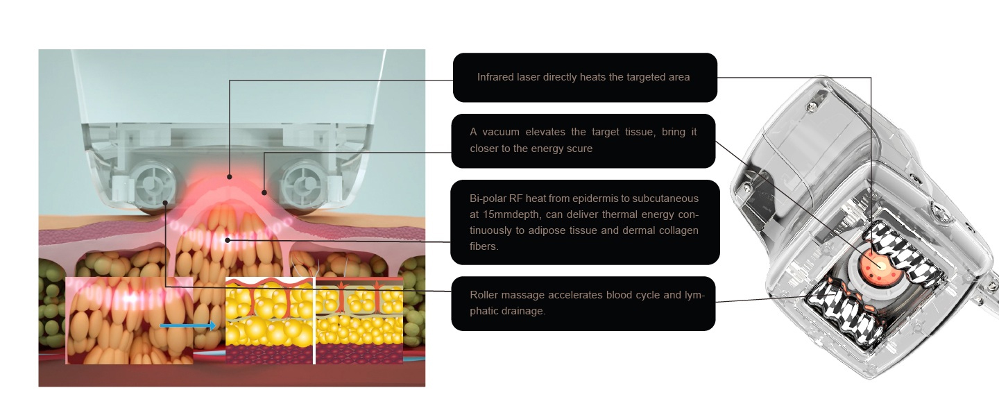 The Eldridge combines five different technologies including IR(Infrared laser), Bi-polar RF, massage roller, vacuum and ultrasound cavitation. The combination of IR, vacuum and RF cause deep heating of the fat cells, their surrounding connective tissue and the underlying dermal collagen fibers. This type of efficient heating and vacuum stimulates the growth of new and better collagen and elastin which results in localized reduction in skin laxity, body volume, and an overall improvement in skin structure and texture. The massage roller causes an immediate increase in circulation and lymphatic drainage, both essential components for healthy skin structure.