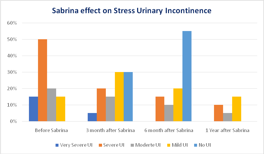 For the majority of patients, four sessions of Sabrina with a 15-day interval were sufficient to alleviate mild or even moderate stress urinary incontinence. No special pre-op preparations or post-op precautions were necessary. Patients could immediately return to their normal everyday activities. Additional advantages of Sabrina are that the procedure is incisionless and virtually painless, with no ablation, cutting, bleeding, or sutures. Recovery is extremely quick without need for the use of analgesics or antibiotics